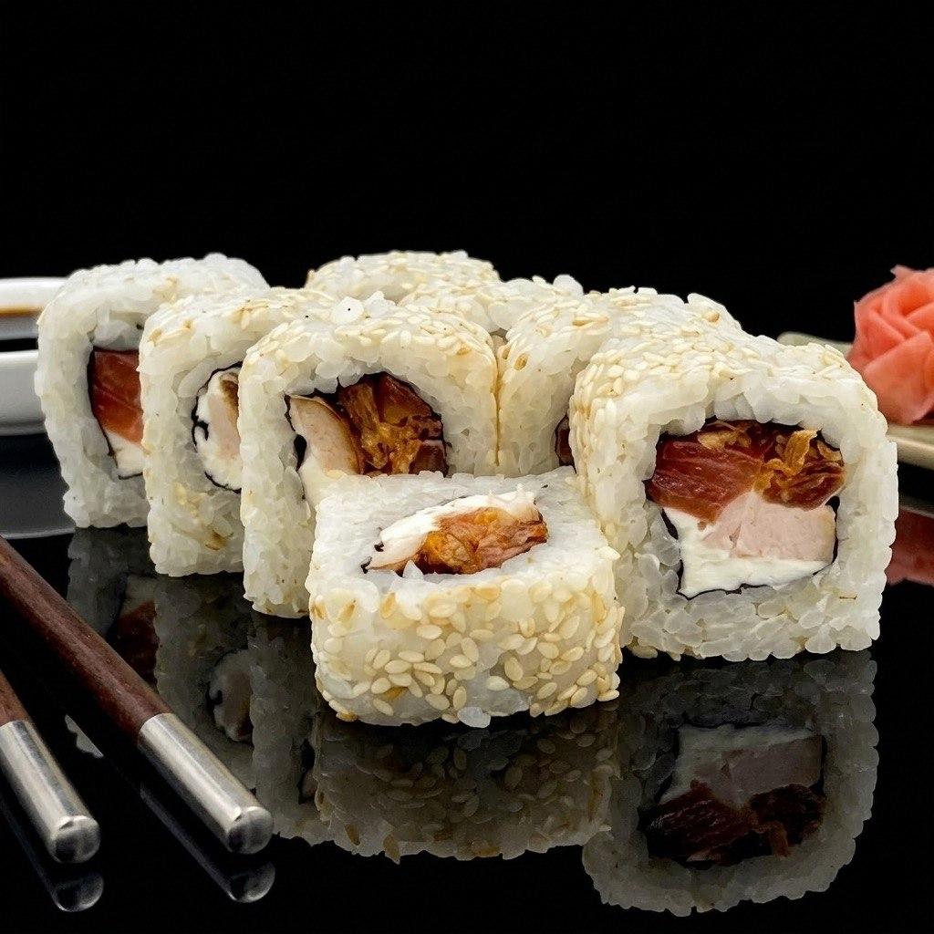 Сочный ролл с нежной курицей, кремовым творожным сыром и свежим помидором. Хрустящий лук фри добавляет приятную текстуру, а золотистый кунжут завершает вкус тёплой ореховой ноткой. Лёгкий, ароматный и очень аппетитный ролл