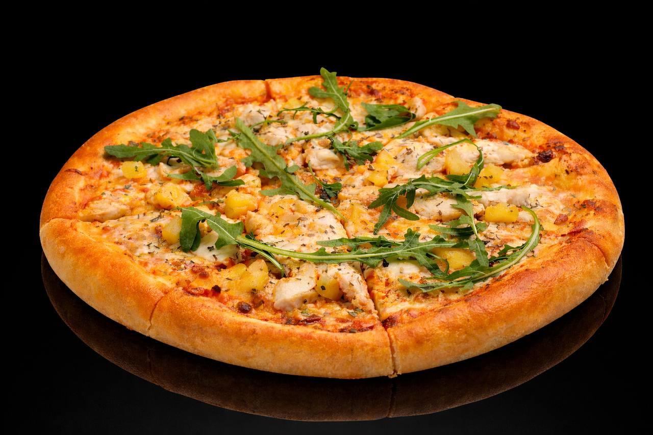 Итальянское тесто, Фирменный соус, Сыр моцарелла, Куриное филе, Ананас