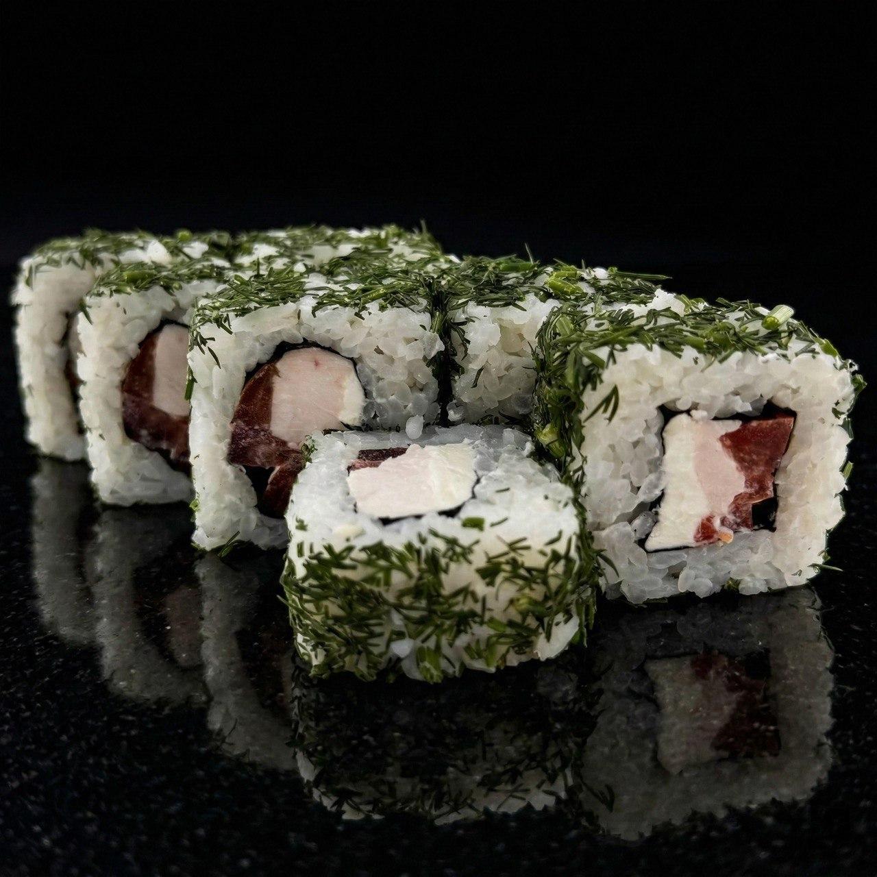 Нежный творожный сыр, сочная курица, свежие помидоры и хрустящий огурец, завернутые в ролл и щедро обваленные в ароматном укропе. Лёгкий, свежий и по-настоящему зелёный вкус в каждом кусочке