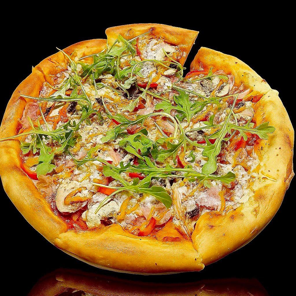 Итальянское тесто, Фирменный томатный соус, Ветчина, салями, Бекон, Пепперони, Шампиньоны, Болгарский перец, Лук, Сыр моцарелла, Соус Парадокс (32см)