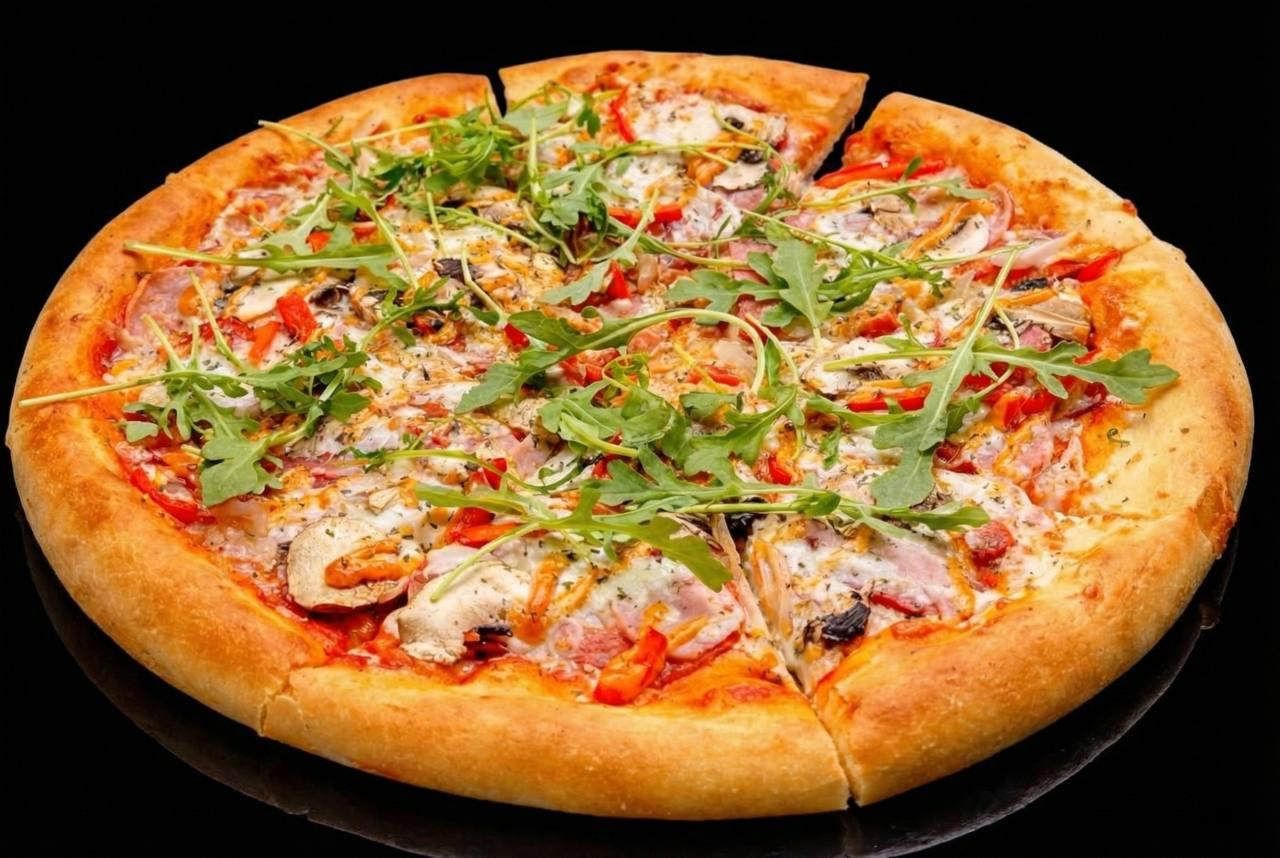Итальянское тесто, Фирменный томатный соус, Ветчина, салями, Бекон, Пепперони, Шампиньоны, Болгарский перец, Лук, Сыр моцарелла, Соус Парадокс