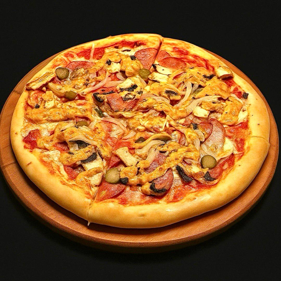 Итальянское тесто, Фирменный томатный соус, Салями, Бекон, Шампиньоны, Пепперони, Лук, Сыр моцарелла, Фирменный бургер соус,