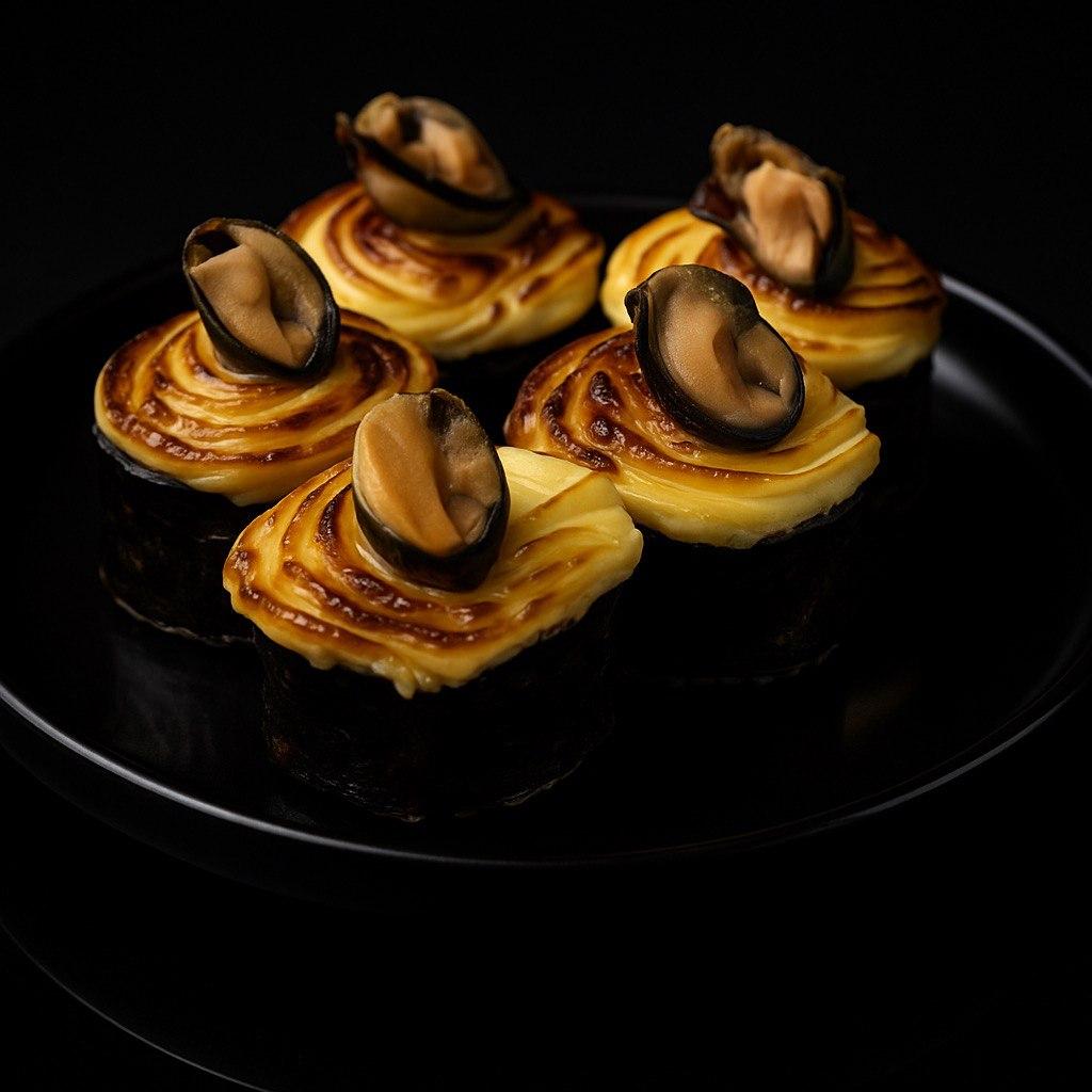 Творожный сыр, Японский омлет тамаго, Фирменный соус, Мидии (5шт 190гр)