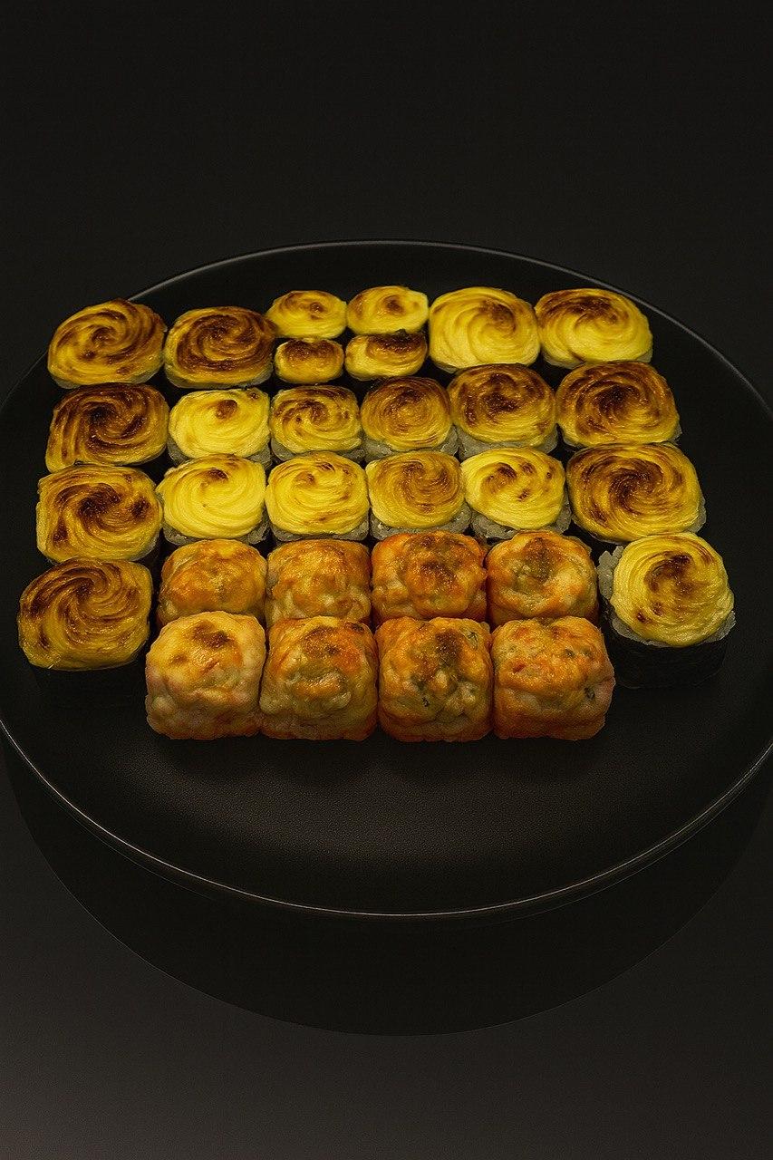 Запеченный с мидиями, Запеченная калифорния с лососем, Запеченный эби, запеченный яки, Запеченная сакура (32шт - 1035гр)
